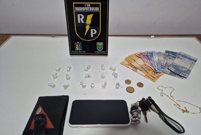 Durante a busca pessoal, foram encontradas porções de substância supostamente entorpecente do tipo crack e R$ 87,45 em dinheiro fracionado. A motocicleta apresentava numeração de chassi violada, configurando adulteração de sinal identificador de veículo automotor.