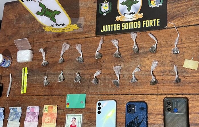 Na busca veicular, os policiais localizaram um pote contendo 14 porções de substância semelhante à maconha, além de um cigarro grande da mesma substância no banco traseiro. No porta-luvas, foi encontrado um saco com vários outros sacos plásticos popularmente conhecidos como “chop”.